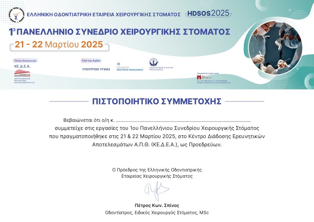 Η παρουσία του D.E.D.I.C στο πρώτο Πανελλήνιο Συνέδριο Χειρουργικής Στόματος το Σάββατο στις 22/03 στην Θεσσαλονίκη ολοκληρώθηκε με τον κ Έξαρχο Δημήτριο να συμμετάσχει ως ομιλητής και ως προεδρείο.Η ομιλία του είχε θέμα “‘Άμεση φόρτιση εμφυτευμάτων στην αισθητική ζώνη .Το κλειδί για διασφάλιση μακροχρόνιας και επιτυχημένης εργασίας.”Στα πλαίσια του συνεδρίου παρουσίασε επίσης σε συνεργασία με την Digident το hands on με θέμα “Απλοποιώντας τις ανυψώσεις ιγμορείου με τα SLA & SCA με ψηφιακή καθοδήγηση και άμεση φόρτιση με το σύστημα εμφυτευμάτων της Neobiotech .Οι συμμετέχοντες είχαν την ευκαιρία να εξασκηθούν σε εκμαγεία ώστε να εξοικειωθούν με τις ανυψώσεις ιγμορείου ,με την ασφάλεια της ψηφιακής καθοδήγησης λαμβάνοντας κατευθείαν αρχικη σταθερότητα των εμφυτευμάτων καθώς και άμεση τοποθέτηση προσωρινής στεφάνης επί αυτών !